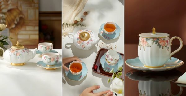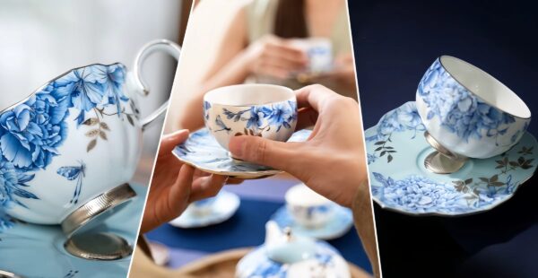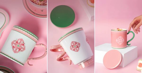 Crisp pastels—mint, blush, snow—splash youthful light on classic porcelain, while orchids and ancient coin motifs whisper “wealth and grace in every direction.”