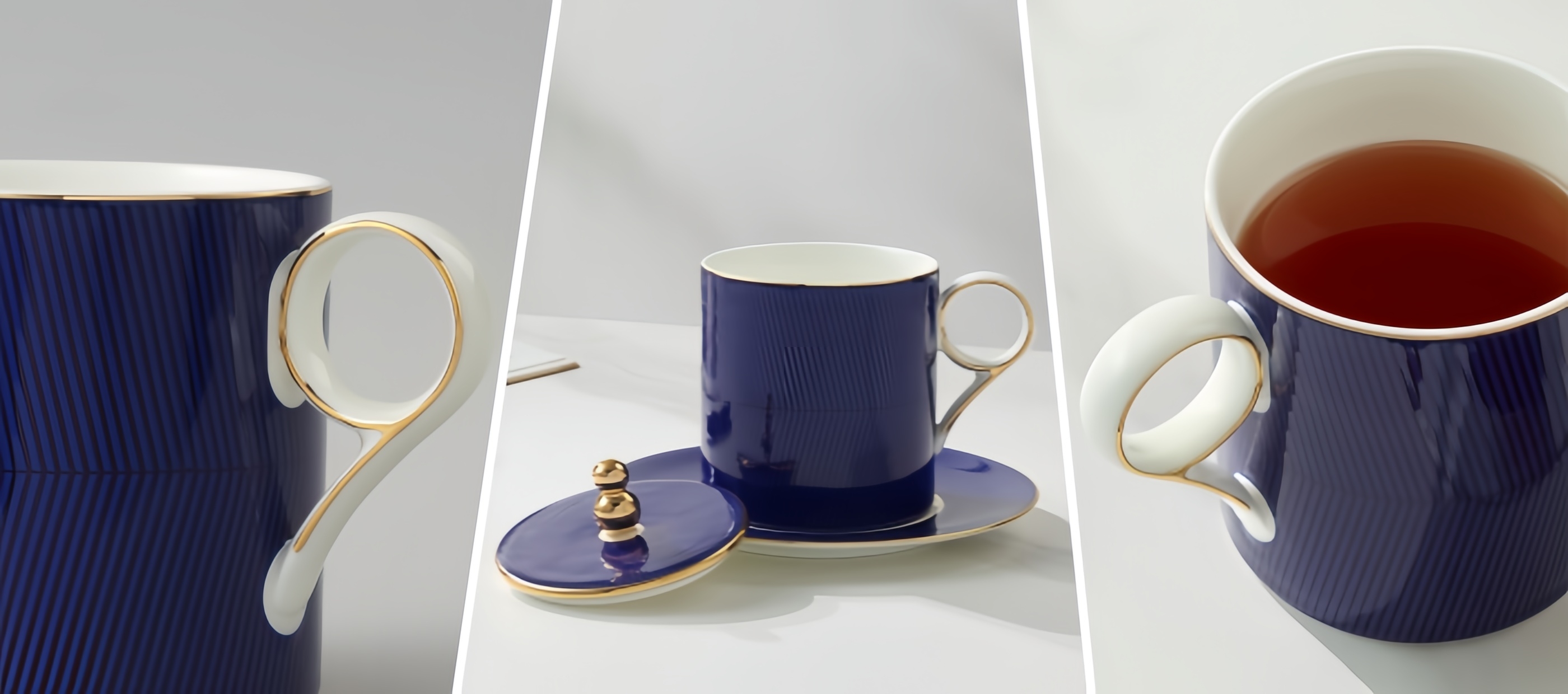Crisp white porcelain cut by deep-blue geometry recalls the river’s own current; a whisper of morning gold edges every piece like sunrise on water.