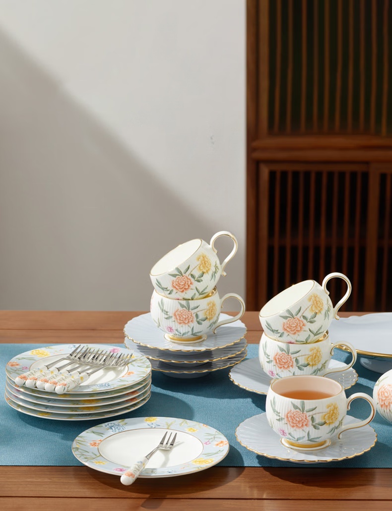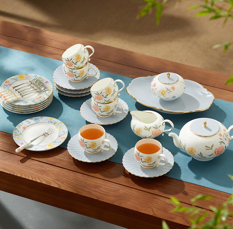 | Packing List | 1 × 700ml double-spout pot 6 × 180ml cups 6 × 145mm saucers 1 × 240ml creamer 1 × 270ml double-compartment sugar bowl 1 × 271mm serving tray 6 × 160mm flat plates 6 × fruit forks |